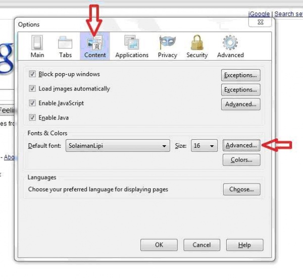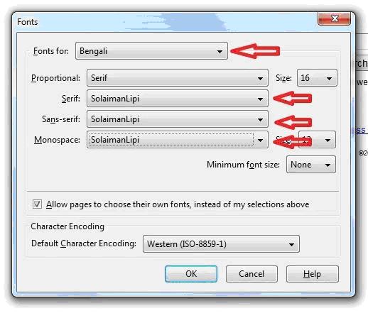 tools > options > content > fonts & colors > default fonts > advance এখানে গিয়ে "fonts for"এ 'bengali' সিলেক্ট করুন। তার নিচের বক্স গুলোতে