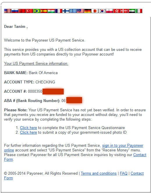 Welcome to the Payoneer US Payment Service. This service provides you with a US collection account that can be used to receive payments from US companies directly to your Payoneer account! Your US Payment Service information: