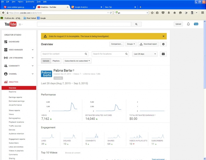 ১ম সমস্যা হলো আমার ইউটিউব চ্যানেলে এডসেন্স ইনপ্রুভ হয়েছে অনেক দিন হলো। ভিউ হয়েছে মোটামুটি ভালই। কিন্তু আয়তো ১ সেন্টও হয় না বা দেখায় না। কারণ কি?