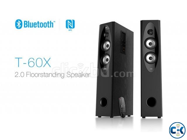 F&D T60X Bluetooth TV Tower Speaker has Bluetooth tower woofer, 1 inch tweeter, 4 inch full range speaker, 8 inch sub woofer, source and Bluetooth button, play/pause/FM auto scan button, previous/CH-, next/CH+, volume+/- button, output power 55 watt x 2 RMS, remote control.