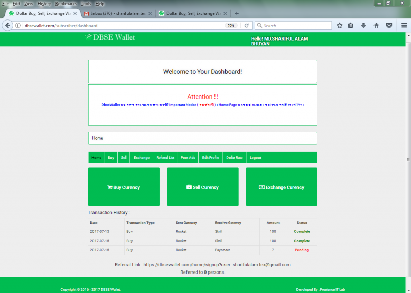 কিছুদিন আগে আমি এই সাইট এর homepage এ সতর্কবানী পরে অনলাইন থেকে ডলার কেনার জন্য আগ্রহী হই। যারা মানবতার জন্য কাজ করে তারা নিশ্চই ভালই হবে। আমি কিছু ডলার কেনার জন্য তাদের দেয়া Hot Line (+88) 01760 844905 ফোন দেই। তাদের সাথে কথা বলি তারা আশ্বস্ত করে। আমি তাদের কাছ থেকে ডলার কিনি এবং আমি সেটা পাই। তারপর আমি আবার ডলার কিনি এইবার ফোন আর দেই নি। হয়ত বিশ্বস্ততা অর্জন কিছুটা বাকি ছিল। তারা সেটা পেমেন্ট করে।
