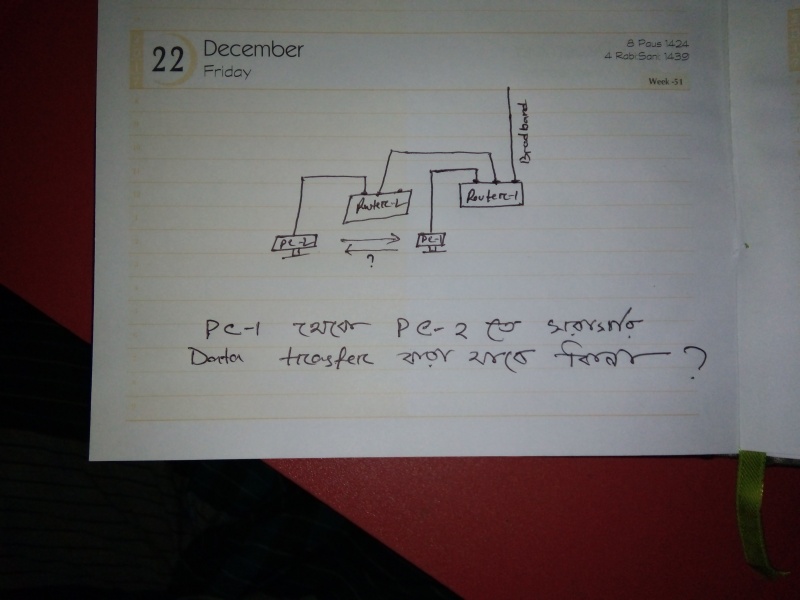 আমি আমার স্থানীয় ইন্টারনেট প্রোভাইডার এর থেকে নেট কানেকশন নিয়ে তাদের দেয়া তার আমার রাউটার এর wan এ কানেক্ট করলাম। আমার রাউটারের lan 1 থেকে ১টি তার দিয়ে আমার পিসি তে নেট কানেক্ট করলাম। আর একটি তার দিয়ে আমার রাউটারের lan 2 থেকে আমার পাশের বাসায় অন্ন একজন এর রাউটারের lna2 তে কানেক্ট করলাম। ২য় রাউটারের lan 3 থেকে একটি তার দিয়ে ২য় পিসিতে কানেক্ট করলাম। দুই জনের পিসিতেই ঠিক ভাবে নেট চলতেছে। পিসি এবং wifi সঠিক ভাবে চলছে।