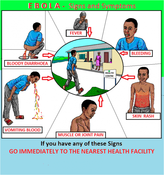 ইবোলা রোগের লক্ষণ হচ্ছে উচ্চ মাত্রার জ্বর হওয়া। রক্তক্ষরণ এবং অনেক ক্ষেত্রেই সেন্ট্রাল নার্ভ ডেমেজ হয়ে যায়। এ রোগে আক্রান্ত হলে মৃত্যুর আশঙ্খা প্রায় ৯০% পর্যন্তও হতে পারে। ২১ দিন পর্যন্ত সময় নিতে পারে এর লক্ষণ পরিলক্ষিত হতে।