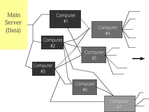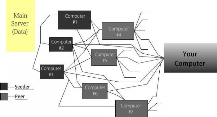আপনি নিচের ছবিগুলো খেয়াল করলে আরও ভালোভাবে বুঝতে পারবেন। দেখুন সেখানে প্রথম মেইন সার্ভার থেকে ১, ২ এবং ৩ নম্বর কম্পিউটার কোন ফাইল বা মুভি ডাউনলোড করা শুরু করেছে। তারপর পরবর্তীতে আরও ৩ থেকে ৪ টি কম্পিউটার মেইন সার্ভার প্লাস পূর্বেই ডাউনলোড শুরু করা কম্পিউটার সার্ভার থেকে সাহায্য নিচ্ছে। আর আপনিও এসে মেইন সার্ভার সহ বাকিসব কম্পিউটার থেকে ডাটা হেল্প নিয়ে ডাউনলোড করছেন।