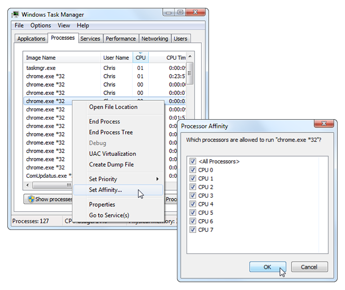 আপনার কম্পিউটারে কোন প্রোগ্রাম কয়টা কোর ব্যবহার করছে কিংবা কয়টা কোর সচল এবং কয়টা কোর স্থির অবস্থায় আছে সেগুলো খুব সহজেই মনিটর এবং কন্ট্রোল করতে পারবেন। আমি আগে উদাহরণ হিসাবে বলেছিলাম যে গুগল ক্রোম একাধিক কোর ব্যবহার করবে যদি একাধিক ট্যাব ওপেন রাখা হয়। আপনারা চাইলে এটা নিজেরাই প্রত্যক্ষ করতে পারেন। যাহোক, কম্পিউটার টাস্ক ম্যানেজার থেকে প্রসেস ট্যাবে ক্লিক করলে খুব সহজেই কোন প্রোগ্রাম কোন প্রসেসর কোর ব্যবহার করছে সেটা দেখা যাবে। তাছাড়াও যেকোন প্রোগ্রামের উপর মাউসের রাইট বাটন ক্লিক করে অ্যাফিনিটি অপশন থেকে প্রসেসরের সবগুলো কোর দেখতে পারবেন।