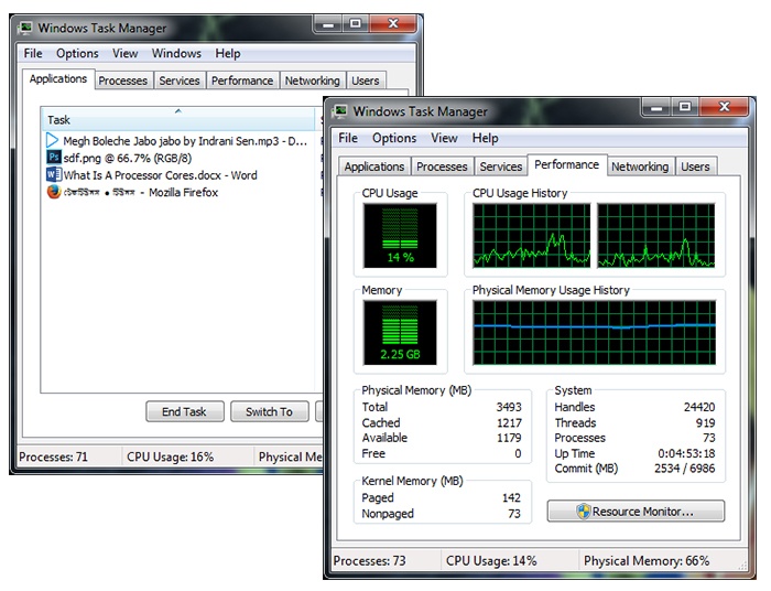 এছাড়াও আপনার কম্পিউটার এর সামগ্রিক কাজের জন্য কোন কোর এবং র্যাম কতোটুকু পরিমাণ ব্যবহৃত হচ্ছে এটা খুব সহজেই নিচের চিত্রের মতো টাস্ক ম্যানেজারের পারফোরমেন্স মনিটর থেকে দেখে নিতে পারবেন। আপনার পিসির কোর যদি কম হয়ে থাকে উপরের চিত্রে সেট অ্যাফিনিটি অপশন থেকে কোর সংখ্যা লিমিটেড করে দিতে পারেন। তাহলে একটি প্রোগ্রাম অন্য প্রোগ্রামের পারফোরমেন্সে বাঁধা দিতে পারবে না।