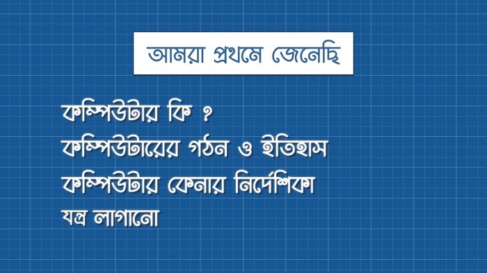 আমরা প্রথমে জেনেছি কম্পিউটার কি, কম্পিউটারের গঠন ও ইতিহাস, কম্পিউটারের যন্ত্রগুলো কোথা থেকে এবং কিভাবে কিনতে হয়, কেনার পর কিভাবেই বা যন্ত্রগুলোকে লাগাতে হয়। তো এখন আমরা কি করবো?