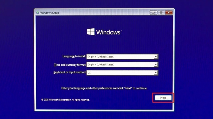 Language To Install = English, Time & Currency format= English (United States) এবং Keyboard or Input Method = US English সিলেক্ট করে Next বাটন চাপুন।
