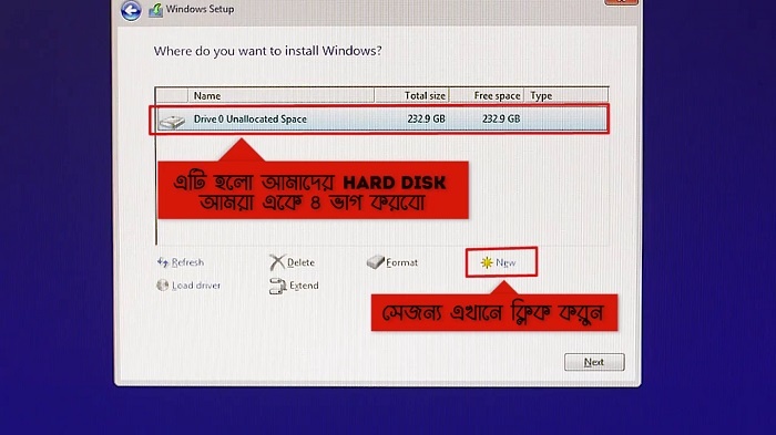 আপনার নতুন হার্ডডিস্ক টি দেখাবে, এটি সিলেক্ট করে New বাটন চাপুন।