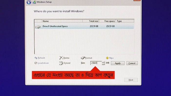 Size এর পাশের বক্সে যে সংখ্যা থাকবে সেটিকে ৪(চার) দিয়ে ভাগ করুন। যা পাবেন তা বক্সটিতে টাইপ করুন,। Apply বাটন চাপুন, নতুন একটি window আসবে, OK বাটন চাপুন