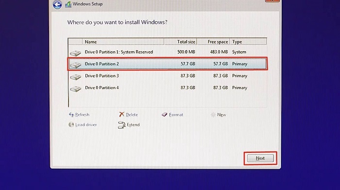 Drive 0 Partition 2 সিলেক্ট করে Next বাটন চাপুন।