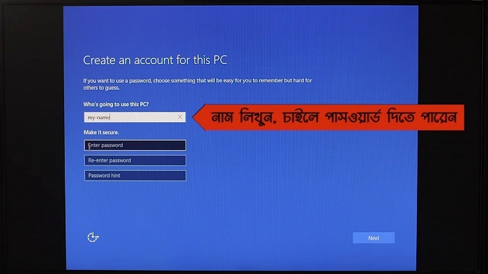 নাম লিখুন, চাইলে Password দিতে পারেন, Next বাটন এ Click করুন