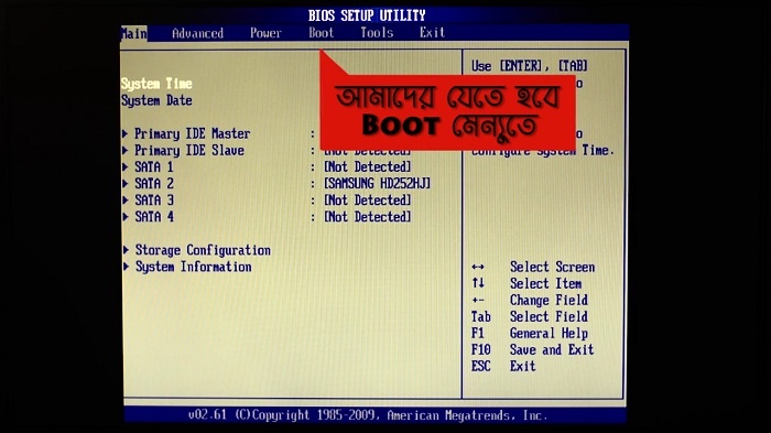 আমাদের কাজ হলো অপারেটিং সিস্টেম ইন্সটল করা আর সেজন্য আমাদের BIOS মেন্যুতে যেতে হবে। BIOS মেন্যুতে যাওয়ার জন্য কম্পিউটার চালু হওয়ার সময় কিবোর্ডের একটি নির্দিষ্ট বাটন বা Key চাপতে হয়। এই Key টি সাধারণত এক এক মাদারবোর্ডে এক এক রকম। তবে সাধারণত যে Key গুলো সবচেয়ে বেশী ব্যাবহৃত হয় সেগুলো হলো F2, Delete, F1, F9, F10, Enter.