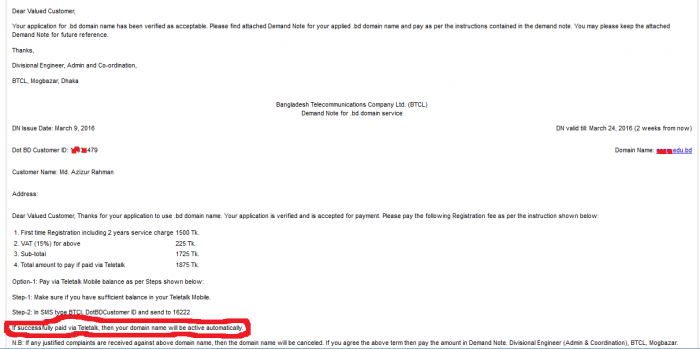 সালাম সকলকে, কেমন আছেন, আশাকরি সকলে ভাল আছেন। এবার বলব আমাদের দেশের ডমিয়েন ক্রয় করার নিয়মাবলী। এটা সত্তি একটি যুগউপযুগি কার্যক্রম, এর আগে আমাদের বিটিসিএল অফিসে ঘুরতে ঘুরতে অবস্থা খারাপ আর অফিসিয়ালি জুট-জামেলা বলা লাগেনা। আর বিভিন্ন হষ্টিং কম্পানিগুলিতে অর্ডার করলে রেট বেশী, কেউ কেউ স্কেন কপি গ্রহণ করে না, কোরিয়ার করে পাঠাতে হয় আরো অনেক সমস্যা। অনলাইনে আপনার কয়েকটা কাগজের মাধ্যমে আপনি সেই কাজ সারতে পারবেন। কোন জামেলা ছাড়া। তাহলে চলুন দেখি কিভাবে করতে হয়।