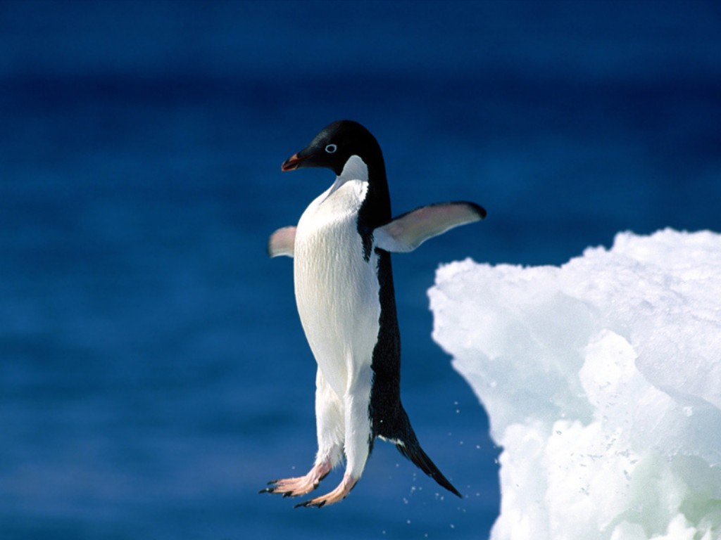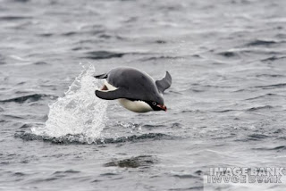 আরেকটা মজার জিনিস জানিয়ে রাখি। পেঙ্গুইনেরা যখন সাঁতারকেটে পানি থেকে ডাঙ্গায় ওঠে, তখন বেশিরভাগ সময় এরা পানি থেকে প্রায় ৬ফুটের মত লাফিয়ে সোজা হয়ে ডাঙ্গায় পড়ে। মনে হয় যেন আকাশ থেকেই দাঁড়ানো অবস্থায়ই ভূমিতে অবতরণ করল!! এ দৃশ্যটা দেখতে অনেক মজার লাগে। অনেকটা পাশের ছবির মত। এ অবস্থায়ই ওরা ডাঙ্গায় গিয়ে পড়ে।