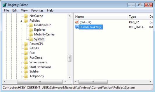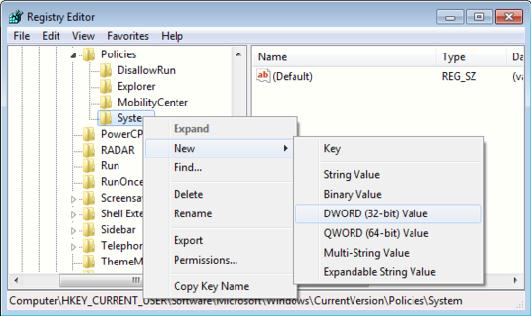 HKEY_CURRENT_USER>Software>Microsoft>Windows>Current Version>Policies>System.