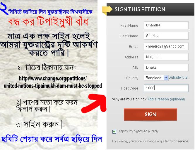 মাত্র এক লক্ষ সাইন করলেই টিপাইমুখী বাধ বন্ধে বাংলাদেশের সহায়তায় এগিয়ে আসবে United Nations।