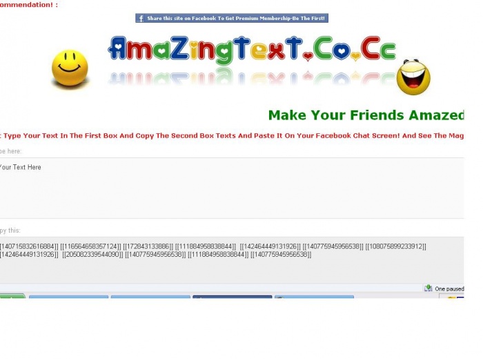 এক্সক্লুসিভ একটি ফেইসবুক ম্যাজিকের ওয়েবসাইট আজ অপেক্ষা করছে আপনার জন্য !! ব্যাবহার করুন আর চমকে দিন আপনার বন্ধুদের!!! চমক টা আমি এখন দেখাব না! নিজেরাই ট্রাই করে দেখে নিন! ফেইসবুক এর চ্যাট স্ক্রীন এ আমরা অনেক রকম স্মাইলি ব্যাবহার করে থাকি । কিন্তু আপনার বন্ধুদের বিভিন্ন রঙের কালির দারা স্টাইলিশ নাম কি ওখানে লিখতে পেরেছেন? অনেকের উত্তর "হ্যা" হতে পারে ,কারন এই নিয়ে কএকদিন আগে একটি টিউন করা হয়েছিল । ওই টিউন এ এক একটা স্টাইলিশ অক্ষরের জন্য এক একটা কোড ইউস করা হত ! এজন্য সময় অনেক নষ্ট হত + এত গুলো কোড মনে রাখাও কষ্টকর!!