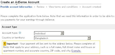 Create an adsense account এ Account type : Individual সিলেক্ট করুন এবং Country or territory : Bangladesh সিলেক্ট করুন