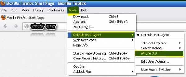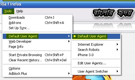 Add-ons দুটি ইনস্টল করার Mozilla Firefox রিস্টার্ট করুন । এরপর Mozilla Firefox মেনুর Tools এ যান । এরপর Tools এ যাওয়ার পর Default User Agent এ যান । এরপর Default User Agent এ যাওয়ার পর iPhone 3.0 এ ক্লিক করুন ।