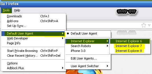 Internet Explorer 6 , Internet Explorer 7 , Internet Explorer 8 । এর জন্য আপনাকে Mozilla Firefox মেনুর Tools এ যান । এরপর Tools এ যাওয়ার পর Default User Agent এ যান । এরপর Default User Agent এ যাওয়ার পর Internet Explorer যে Version টি ক্লিক করবেন , তাহলে সেই Version টি ব্যাবহার করতে পারবেন ।
