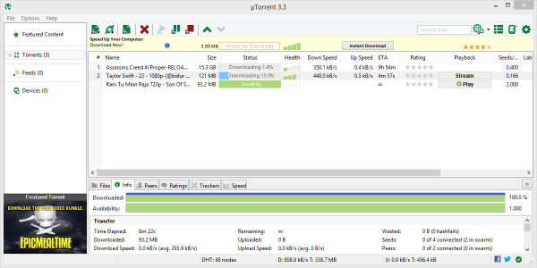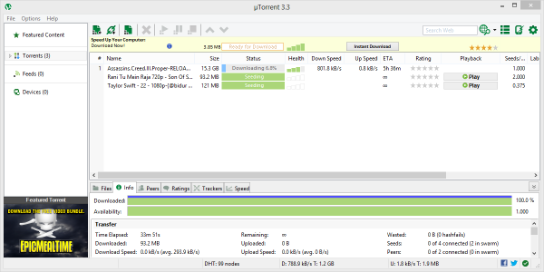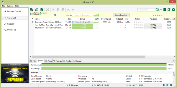 সেদিন ইন্টারনেট ঘাটতে ঘাটতে একটা সাইট এর ঠিকানা পেলাম। সাইট টার নাম NaturalBD.CoM । এটা একটা টরেন্ট সাইট + ডিরেক্ট ডাউনলোড সাইট। প্রথমে আমি utorrent client দিয়ে একটা ফাইল নামাতে শুরু করলাম। দেখি যে একি স্পীড। আগে torrent এ স্পীড পাইতাম ২০/৩০ কেবি। তাই রাগ করে টরেন্ট নামাইতাম না। কিন্তু সেদিনই প্রথম আমি torrent দিয়ে এই স্পীড পাই। মনটা খুব খুশি হয়ে গেল আমার। নিচে কিছু স্ক্রীনশর্ট দিলাম দেখলেই বুজতে পারবেন যে কেমন স্পীড পাইছি। Assassin's Creed III ১৫ জিবি এর আই এস ও ফাইলটা কয়েক ঘণ্টায় নামিয়ে নিলাম। ৪ দিন খেলার পর গতকাল গেম টা শেষ করলাম। এই গেম এর ডিভিডি কিনতে গেলে মিনিমাম ২০০ টাকা লাগত। তা আমার নেট এর নরমাল স্পীড ৩০/৩৫ কেবি। ওটা নামাইতে গেলে মাস খানিক পার হয়ে যেত আমার। কিন্তু এই torrent দিয়ে আমার চরম লাভ হইল। সেই সাথে আরও অনেক মুভি এবং ভিডিও গান ও ডাউনলোড করেছি।