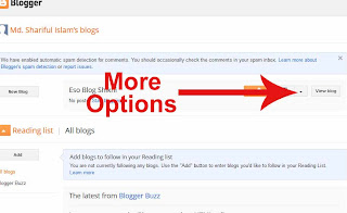 এবার More options -এ যান।(উপরের ছবিটি তে তীর চিহ্ন দ্বারা More options এর অবস্থান দেখানো হয়েছে) মনে রাখবেন ব্লগের সমস্ত টুলস্ গুলো এখানেই রয়েছে। More options এর পাশে Veiw blog এ ক্লিক করে আপনি আপনার ওয়েব সাইট টি দেখতে পারবেন।(যেহেতু আপনি এখনো কোন পোষ্ট করেন নি, সেহেতু আপনি আপনার ওয়েব সাইট টি খালি দেথতে পাবেন। যাইহোক, আমরা একে একে প্রত্যেকটি টুলস্ এর ব্যবহার সম্পর্কে জানব।