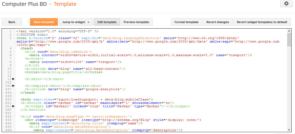 ২য় পদ্ধতি: এছাড়াও আপনি আপনার টেমপ্লেট টি কে অন্যভাবেও আপলোড করতে পারবেন। এটি করার জন্য আপনার টেমপ্লেট টি কে Notepad/Notepad++/Netbean ইত্যাদি দিয়ে ওপেন করুন। তারপর কিবোর্ড থেকে Ctrl এবং A একসাথে চেপে অথবা মাউসের রাইট বাটনে ক্লিক করে select all নির্বাচন করুন। পুরো লিখাটি সিলেক্ট হলে এবার আপনি পুরো লিখাটি কে copy করে নিন এবং ব্লগার ড্যাসবোর্ডে যান। সেখান থেকে টেমপ্লেট নির্বাচন করুন। তারপর Edit HTML এ ক্লিক করুন নিম্নের ছবিটির মত পেজটি দেখতে পাবেন।