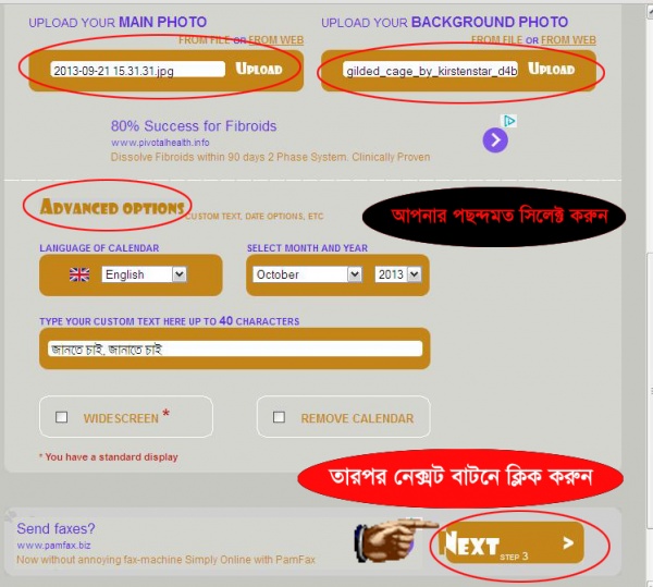 এবার ক্যালেন্ডারের মাস ও বছর নির্বাচন করার জন্য Advance option মেনুতে ক্লিক করুন। ইচ্ছে করলে Advance option থেকে আপনি ক্যালেন্ডারে নিজের নাম বা কোনো বার্তা লিখতে পারেন। সবশেষে Next অপশনে ক্লিক করলেই তৈরি হয়ে যাবে আপনার কাঙ্ক্ষিত ক্যালেন্ডার।