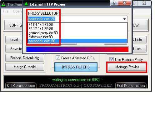 যদি আপনি Proxy Server পরিবর্তন করতে চান তাহলে Proxomitron এ manage proxies এ ক্লিক করে নিচের মত Proxy Server সিলেক্ট করতে পারেন ।