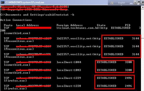 উপরের ছবিতে দেখা যায় আমার পিসিতে শুধু Proxomitron , Firefox Browser এবং cometbird এ ইন্টারনেট ব্যবহার হচ্ছে । এগুলো পরিচিত নাম তাই হয়ত PID ছাড়াই আপনি এগুলো বন্ধ করতে পারেন । কিন্তু অনেক ক্ষেত্রে PID প্রয়োজন হবে ।
