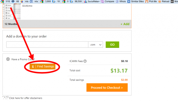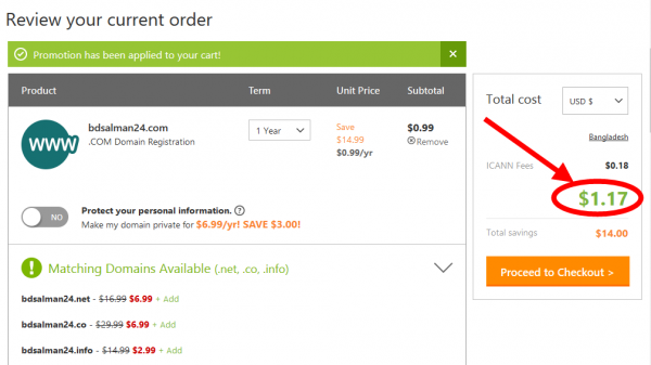 ইন্সটল শেষে domain কেনার জন্য GoDaddy.com এ যেয়ে আপনার পছন্দের domain search করুন। এরপরে Continue to checkout এ ক্লিক করুন।