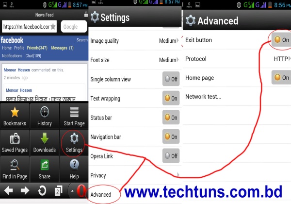 ৩। আমরা যে কোন প্রোগ্রামে থেকে বাহির হতে হলে Exit বাটনে ক্লিক করে বাহির হতে হয়, কিন্তু Opera Mini তে ডিফল্ট ভাবে Exit বাটন OFF থাকে তাই On করতে হলে নিচের পদ্ধতি অনুসরণ করুন।