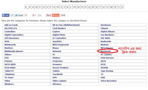 প্রথমে আপনি আপনার পিসি আর ল্যাপটের এর মডেল নাম্বার লিখে রাখুন তারপর এখানে ক্লিক করুন। তাহলে নিচের মত আসবে আমি ল্যাপটের এর ড্রাইভার ডাউনলোড করব তাই Notebook এর ক্লিক করলাম।