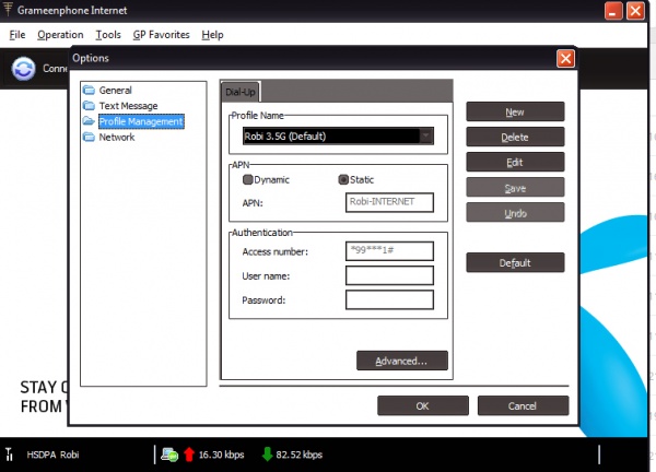 > এবার গ্রামীণফোন ইন্টারনেট সফটটি ওপেন করুন এবং অপশন মেনু থেকে নতুন একটি কনফিগারেশন তৈরি করে নিনঃ