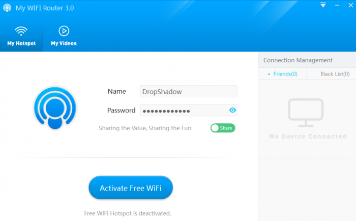 ডাউনলোড করা যদি শেষ হয় তাহলে চলুন ব্যবহার বিধি দেখে নেই। আগেই বলেছি সফটওয়্যারটির ব্যবহার খুবই সাধারন, কারন এটা নিজে থেকেই আপনার কানেকশনের প্রকৃতি ডিটারমাইন করতে পারে। আপনি যখন সফটওয়্যারটি চালু করবেন তখন নিচের মতো চিত্র দেখতে পাবেন। আপনার কাজ হলো আপনার হটস্পটের জন্য একটা নাম এবং পাসওয়ার্ড নির্বাচন করে একটিভেট ফ্রি ওয়াই-ফাই বাটন প্রেস করা। তারপরেই সব আনন্দ আপনার, আমি ভাগ চাইতে জীবনেও আসবো না।