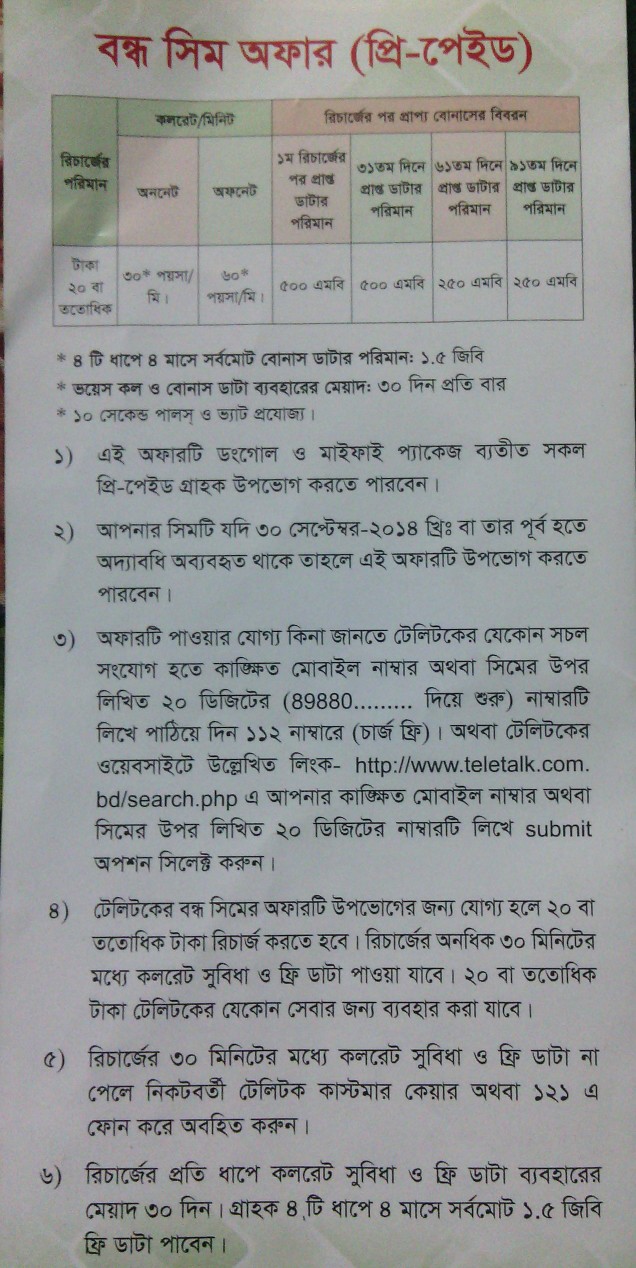 আপনার নম্বরটি আমাকে জানানোর সময় অবশ্যই এক মিনিট কল দিবেন (মিস কল দিবেন না ) । আপনাকে তো অফারটির জন্য ২০ টাকা রিচাজ করতেই হবে, তাই আমি চাই আপনি টাকা দিয়ে কাড না কিনে আমার কাছ থেকে ফ্রীতে নিয়ে নিন । আপনি ভাবতে পারেন, যদি আমি আপনাকে ২০ টাকার Teletalk recharge card না দেই ??? আমার উপর বিশ্বাস রাখুন, অবশ্যই আমি আপনাকে ২০ টাকার Teletalk recharge card পাঠিয়ে দিব । আমার কাছ থেকে ফ্রী ২০ টাকার Teletalk recharge card পাবেন ১৭/০২/২০১৫ তারিখ পযন্ত ।