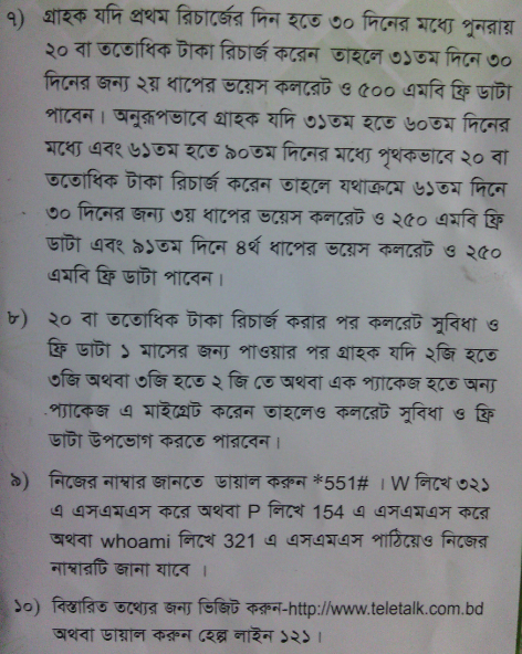 আপনার টেলিটক সিমটি নিস্ক্রিয় অথবা মেয়াদ উত্তীর্ণ হয় তবে অপনার নম্বরটি আমাকে জানান (০১৭৫৯৭৩৬৭৫১) । আপনার নিজের নম্বরটি জানতে মোবাইলের ম্যাসেজ এ গিয়ে "tar" লিখে "321" এ send করুন । আমাকে জানানোর কিছুক্ষণের মধ্যে আপনার নম্বরে একটি পিন নম্বর যাবে, সেই পিন নম্বরটি আমাকে ১০ ঘন্টার মধ্যে জানালে আমি আপনাকে ২০ টাকার Teletalk recharge card কল করে অথবা ম্যাসেজ এর মাধ্যমে পাঠিয়ে দিব ।