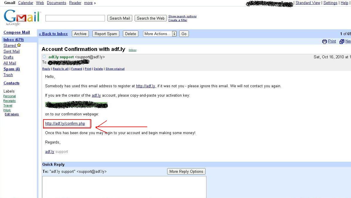 ৪.ফাকা অংশে কোডটি পেস্ট করুন। এরপর submit বাটনে ক্লিক করুন। আপনার একাউন্ট অ্যাকটিভ হয়ে যাবে।এরপরে আপনার ব্রাউজারে adf.ly লিখে এন্টার দিন