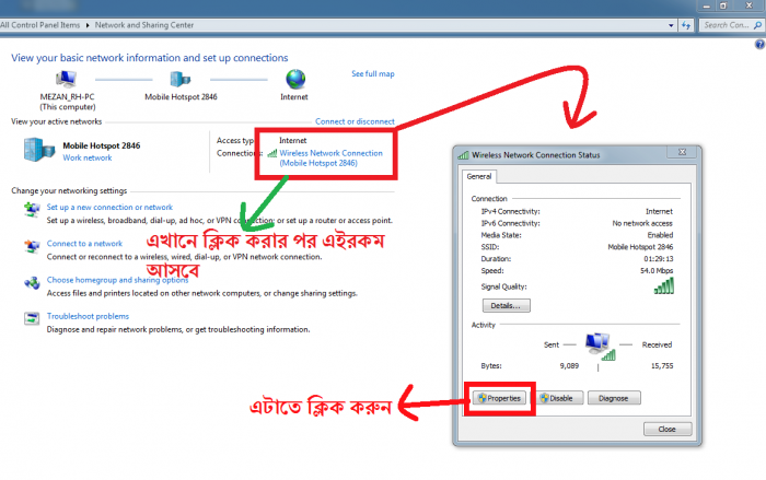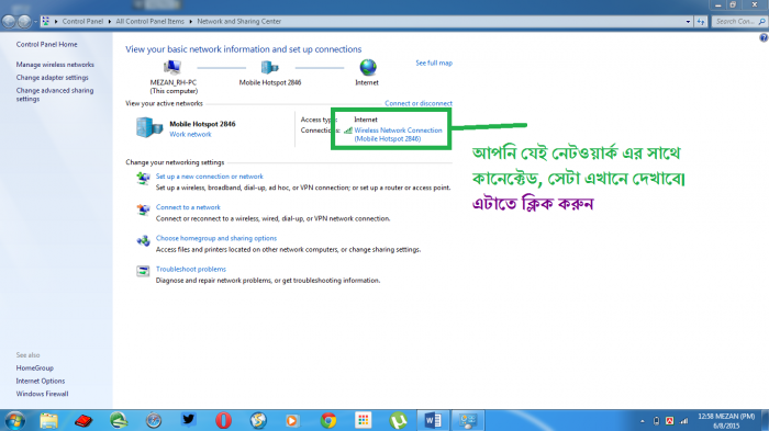 Network and Sharing center চালু হলে নিচের মত দেখাবে। আপনার কানেক্টেড নেটওয়ার্ক এর উপর ক্লিক করুন। নিচের মত::