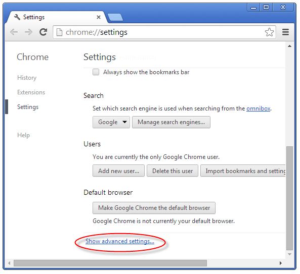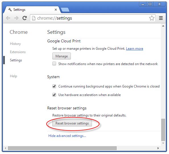 Google Chrome এর options icon (ব্রাউজারের উপরের ডান পাশে), পেজের নিচে “Show advanced settings…” অপশন হতে পেজের নিচে “Reset Browser setting” হতে ব্রাউজারটি রিসেট করুন। এখন আপনার পিসিটা রির্স্টাট করুন।