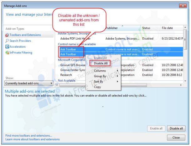 Internet Explorer ওপেন করুন তারপর Tools মেনুতে (শর্টকার্ট “F10”) এবং সেখানকার Internet Option এ configuration page ওপেন হবে সেখান হতে ক্লিক Programs tab তারপর Manage Add-ons, এখন আপনি সকল add-ons এর installed লিস্ট পাবেন। এখান থেকে “Mystartsearch.com” সহ সমস্ত অপরিচিত ও অপ্রয়োজনীয় Uninstall করুন।