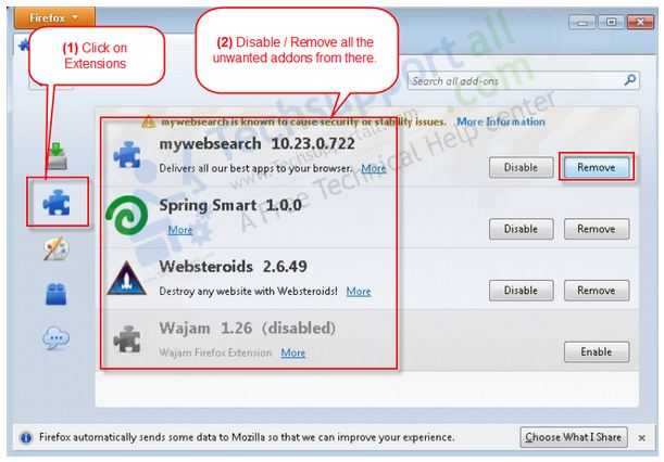 Mozilla Firefox ওপেন করুন তারপর Tools মেনুতে (শর্টকার্ট “F10”) এবং Add-ons ওপেন করুন এবং বামদিক হতে Extensions পেজটি ওপেন করে এখন আপনি সকল Add-ons এর installed লিস্ট পাবেন। এখান থেকে “Mystartsearch.com” সহ সমস্ত অপরিচিত ও অপ্রয়োজনীয় Uninstall করুন। তারপর আপনার পিসিটা রির্স্টাট করুন।