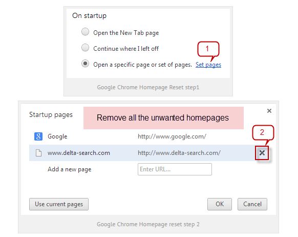 Google Chrome এর Start । অতপর ক্লিক options icon (ব্রাউজারের উপরের ডান পাশে), তারপর ক্লিক করুন Settings এ, এখন আপনি configuration page টা পাবেন। Configuration page এর On Startup “Open a specific page or set of pages” অপশনে Set Pages ক্লিক করুন তখন নতুন একটা উইন্ডো পেজ পাবেন, সেখান হতে সমস্ত URL’ ডিলিট করে আপনার ব্যবহারের Search Engine টি প্রবেশ করিয়ে ok করুন।