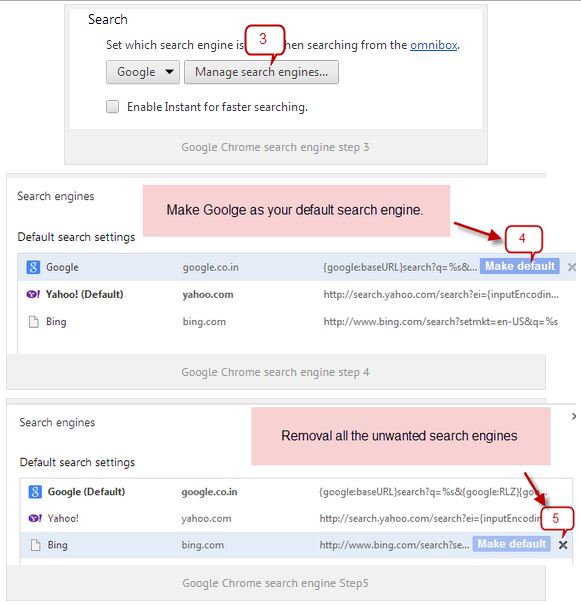 একই পেজে Manage search engines বাটন এ goole.com ছাড়া সমস্ত search engines ডিলিট করুন: