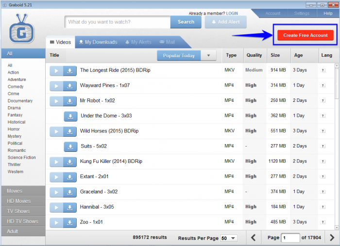 তারপর আপনার Desktop এ ইনস্টল হওয়া Graboid Icon এ ক্লিক করে Email & Password দিয়ে Login করলে নিচের ছবির মত একটি উইনডো আসবে। সেখান থেকে আপনার পছন্দের মুভি এক ক্লিকে ডাউনলোড করুন।