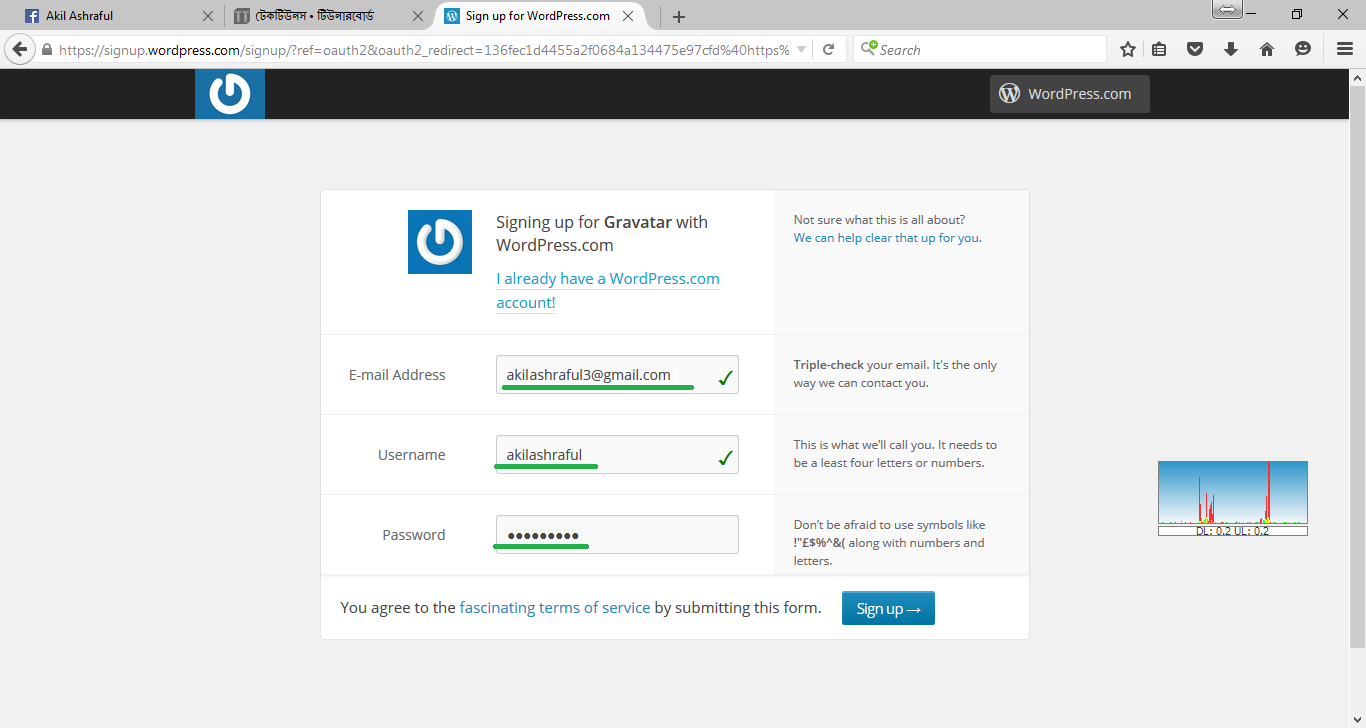 E-mail Address, Username & Password দিয়ে Sign Up এ ক্লিক করুন। নতুন একটা পেজ আসবে, বলবে আপনার মেইল চেক করতে। (অবশ্যই টেকটিউনস এ আপনি যে ইমেইল ব্যবহার করবেন সেই ইমেইল দিয়েই ওয়ার্ডপ্রেস অ্যাকাউন্ট খুলতে হবে। )