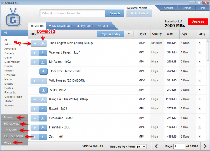 তারপর আপনার Desktop এ ইনস্টল হওয়া Graboid Icon এ ক্লিক করে Email & Password দিয়ে Login করলে নিচের ছবির মত একটি উইনডো আসবে। সেখান থেকে আপনার পছন্দের মুভি এক ক্লিকে ডাউনলোড করুন।