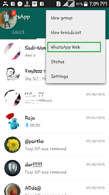 এবার মোবাইল দিয়ে ওয়াটসঅ্যাপ এ ঢুকুন। মেনুতে গিয়ে "WhatsApp Web" এ ক্লিক করুন।