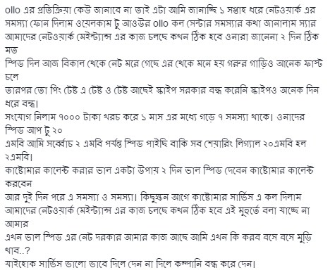 আমি যশোর এর একজন ইউজার নতুন ইন্টারনেট আবার 4G network তাদের ক্যামপেইন চলাকালীন তাদের একজন লোক এর সাথে কথা বললাম যে আপনাদের কি কি সুযোগ সুবিধা আছে তো তখন আমাকে তাদের প্যাকেজ সর্ম্পকে বলল আর মোবাইলে স্পিড মিটারে ২০এমবিপিএস শো করায় দেখায় দিল আর বলল নিজ চোখেয়তো দেখলেন একটা ১জিবি মুভি নামতে ৪ থেকে ৫ মিনিট লাগবে। আপনাদের ডিভাইস এর দাম কত আমাদের ডিভাইস এর দাম ৭০০০ টাকা আর শুধু সিম - ৯০০ টাকা। তারপর ১ মাস পরে আমি তাদের ডিভাইস কিনতে যাই ওলো এর অফিসে ৭০০০ টাকা জমা দিয়ে টেষ্ট করার জন্য একটা ডিভাইস নিয়ে আসি এবং আমার বাসায় টেষ্ট করলাম অবশ্য আমাদের যশোর এর কভারেজ মনিহার পর্যন্ত মনিহার থেকে ৩০০ গজ পিছনে আমার বাসা যাইহোক নেটওয়ার্ক টেষ্ট করলাম নেটওয়ার্ক পায় কিন্তু মাঝে মাঝে কম পায়। ওদের ডিভাইস ফেরত দিয়ে নতুন ডিভাইস নিলাম ১মাসের প্রথম ২৭ দিন খুব ভাল স্পিড পাইছি এর পর শুরু হল ঝামেলা। ফোন দিলাম কাস্টোমার কেয়ারে এবার শুরু হল কাহিনী স্যার আপনার সমস্যা কতদিন ধরে এই সমস্যা হচ্ছে আপনার ইউসিম নম্বর টা বলেন বললাম এখন বলে ব্রাউজার এর কুকি,হিস্টেরি,সব পরিস্কার করুন আমি বলাম করাই আছে। এবার বলে http://ollo.speedtest.net এ গিয়ে স্পিডটা টেষ্ট করেন আমি বললাম এই পেজই তো ওপেন হয় না তাহলে পিং টেষ্ট করেন করলাম এবার এভারেজ লস বলেল বললাম তখন প্রায় মোবাইলে ২২ মিনিট হয়ে গেছে প্রতিমিনিট কল চার্জ প্রায় ২ টাকার কাছাকাছি এবার বলে কোন সমস্যা না স্যার আপনার সমস্যাটি আমাদের কনসলট্যাট ডিপার্টমেন্ট এ পাঠিয়ে দিছি আপনার সাথে যোগাযোগ করা হবে ২দিন হয়ে গেল তারপর ২ দিন পর ঠিক হল।